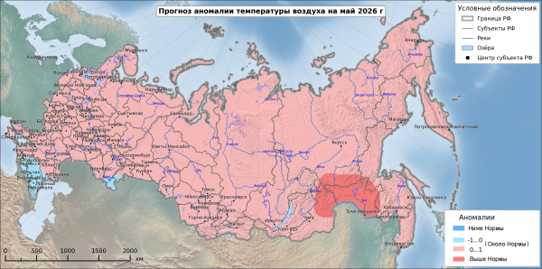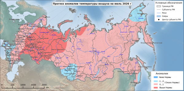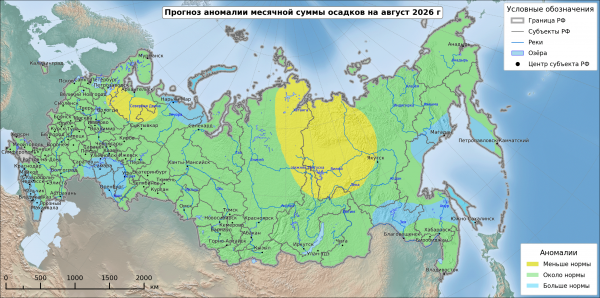 Выше нормы средняя месячная температура предполагается на востоке Северо Западного, Центрального и Южного федеральных округов, в Приволжском федеральном округе, на большей части Уральского федерального округа, на Таймыре. Больше нормы месячное количество осадков предполагается на севере Сибирского федерального округа и на севере Якутии.