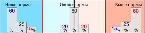 Например, градация температуры «Ниже нормы» прогнозируется, если вероятность осуществления этой градации не менее 60%, при этом вероятность аномалии противоположного знака составит не более 15%, а вероятность «Около нормы» - 25%.