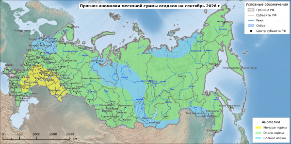 Выше нормы средняя месячная температура предполагается на востоке Северо Западного, Центрального и Южного федеральных округов, в Приволжском федеральном округе, на большей части Уральского федерального округа, на Таймыре. Больше нормы месячное количество осадков предполагается на севере Сибирского федерального округа и на севере Якутии.
